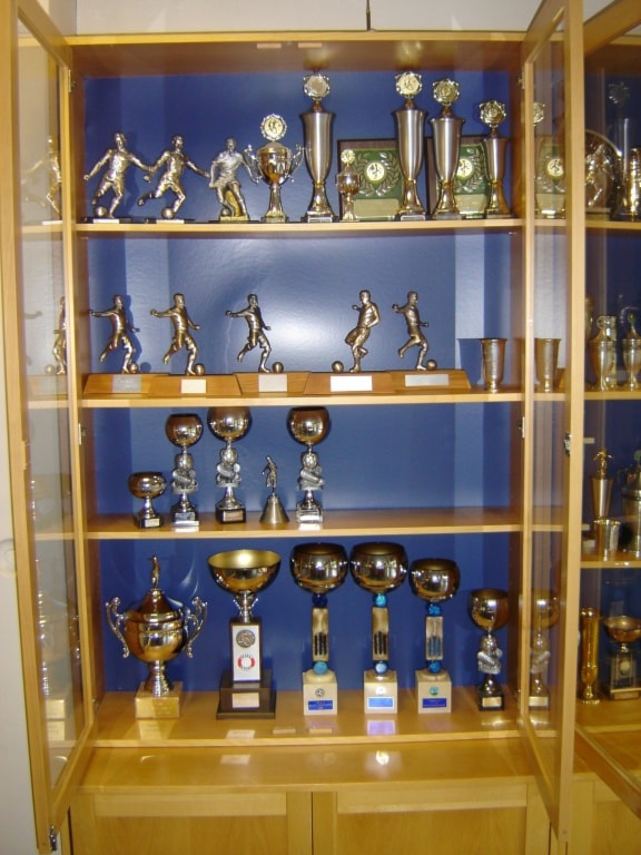 I dette skapet står fleire av dei gjevaste pokalane Hareid IL Fotball har fått; mellom anna mange krinsmeisterskap.